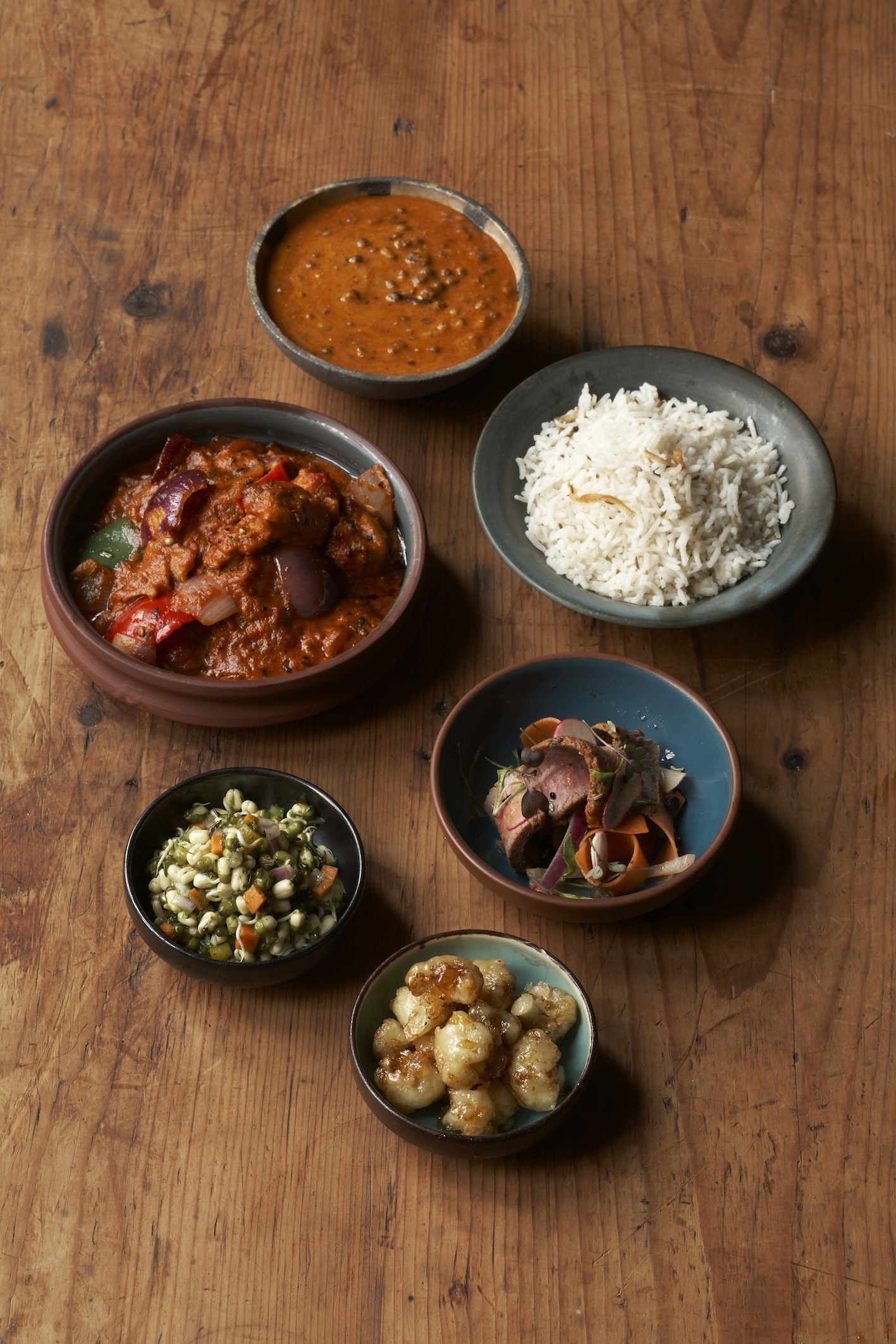 The lunch menu itself has been cleverly split by head chef Vivek Singh into a grazing menu and a more a la carte tapas style menu of small dishes all comfortably priced from a lowly 5 pounds. We decide to go for the grazing menu as that seemed to offer a good mix of about 6 dishes which at 10 pounds per head seemed like an absolute steal! And a steal it is. As the dishes came the aroma has us salivating long before they reached the table. The portion sizes were enough for 2 big city high flyers to comfortably lunch, and then some! So, what did arrive? Well a feast of black lentil dahl, stir fried cauliflower, grilled lamb salad, kadahu chicken curry, a crunchy salad and pilau rice. We couldn’t wait to tuck in.