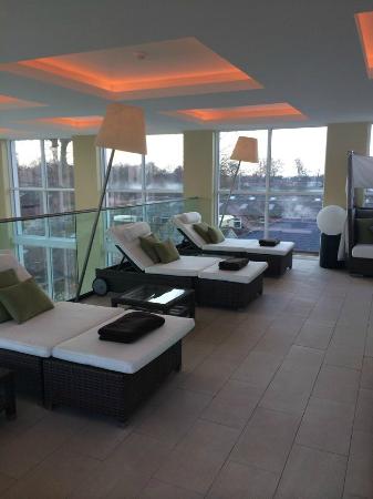changing rooms were spacious and the products first class, we were also given to wear a thick comfortable robe and slippers. This amazing spa is simply stunning, modern and luxurious, every detail has been well thought out and designed impeccably. To me this one of a kind place is 5 star all the way, no detail has been left behind. The outstanding hydrotherapy pool shares an array of delightful water features to massage and relax you, with the pool looking out onto a perfectly kept country garden, with an outside seating area for days when the sun shines. High walls and led ceiling lights with changing colours helped ensure this enchanting pool was very addictive and we were lucky enough to have the hydro pool to ourselves.