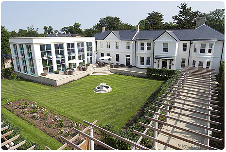The building is set in pretty grounds between luscious trees, flowers in bloom and lawn perfectly mowed in stripes.