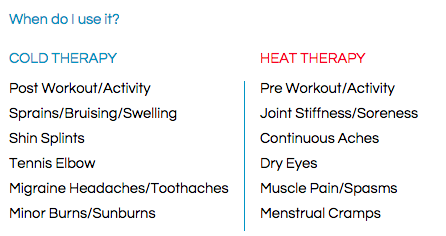 Heat therapy increases circulation (blood flow), effectively relaxing muscles & easing movement. Stimulating blood flow to injured areas once swelling has gone down promotes healing & speeds recovery of damaged tissue.