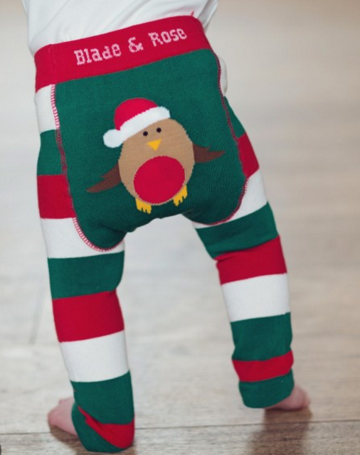 With Christmas around the corner these cute little leggings are perfect to pop on your baby and get you in the Christmas mood. They are Christmas tree green, red and cream, chunky striped leggings with a robin in a Santa hat on the bum. These fun leggings fit well, are soft and bound to put a smile on your face as soon as you pop them on your little one. Available from newborn to aged 4.