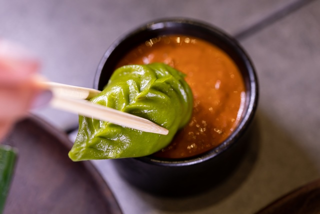 With the Chicken momo, you immediately smell the aroma of the heavenly moist chicken. The spring onions and garlic are a perfect touch and the soy gives the momo a glistening appearance. The spicy chutney is the perfect match with this momo as it kicks your tastebuds into gear.