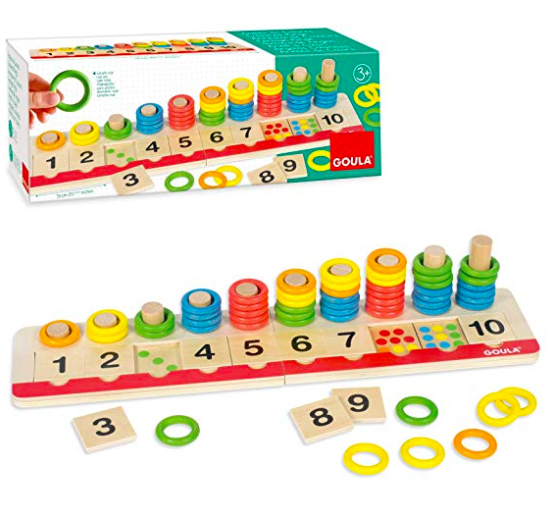 The game aims to help children learn number and quantity concepts by placing the different coloured rings on the posts to meet the number along the base.