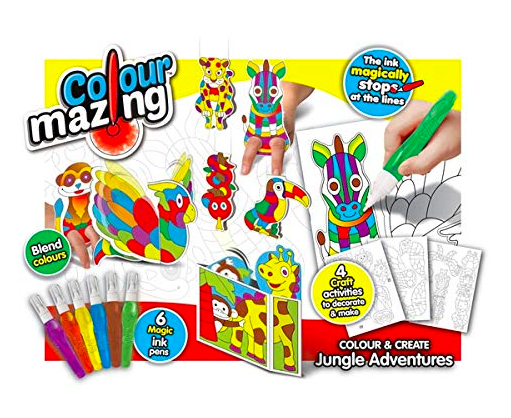 ColourMazing is the new, innovative and exciting way to colour in! Spread the ink, blend the colours seamlessly together and watch as the ink magically stops at the lines to create colourful jungle scenes. ColourMazing is a great way to keep children entertained while travelling or at home as a fun rainy-day activity. Includes four craft activities to decorate and make, as well as four magic ink pens.