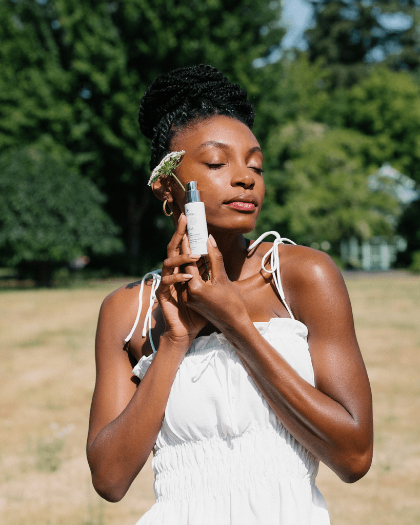 Next I spritz my face with the alcohol free toner, to close the pores and enhance the appearance of skin brightness and tone (it’s the Vitamin B3 I’m told, and the whole range is loaded with vitamins and botanicals that attract moisture). I’ve also used this ad hoc on a couple of warmer days and to refresh when I’ve spent too long at the computer.