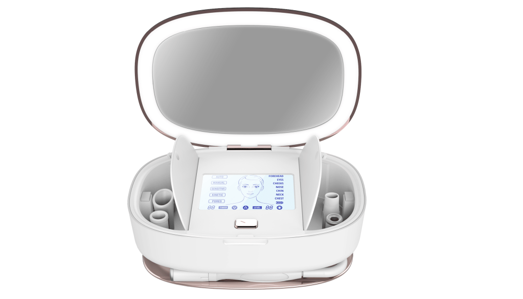The touch screen allows you to choose the treatment mode between 3 different microdermabrasion modes, kinetic toning, or pore extraction.