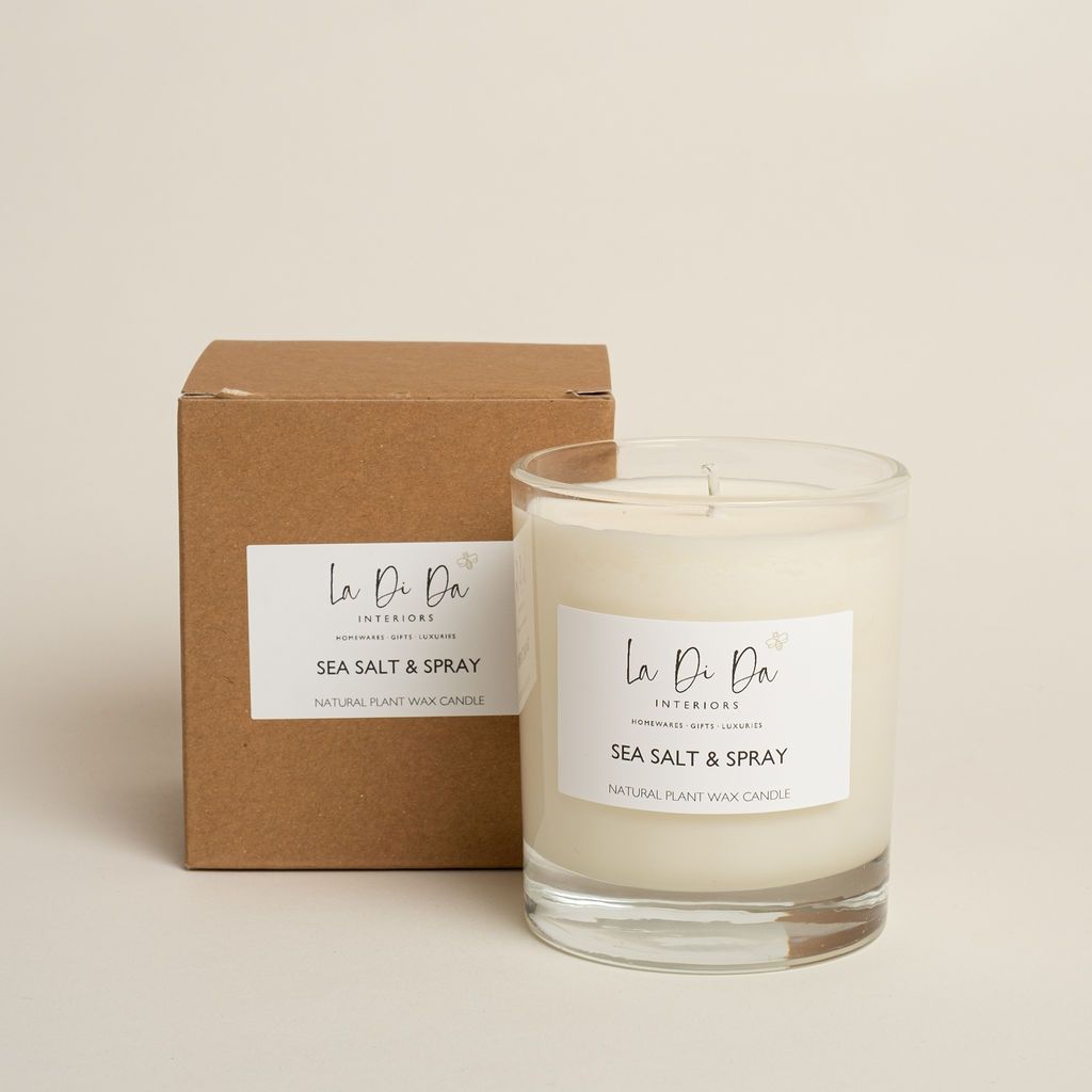 Make your home smell fabulous with this luminous Sea Salt and Spray candle hand-made with 100% organic plant wax exclusively by La Di Da Interiors. The Sea Salt and Spray candle offers a natural fragrances which reminds you of a day at the beach, something we are sure we are all doing especially with this beautiful weather we are experiencing. The Sea Salt reminds you of the sounds of the waves crashing against the shores and the sky blue blanket that covers the sky and is a home to the shining sun. It reminds us all of a time where we didn’t have a care in the world and we just…lived. Available in either full candle size (approximately 60 hours burn time) or votive (approximately 30 hours burn time) these are packaged in recycled brown card boxes. These are a wonderful way to scent your home, make a fabulous gift for dinner parties or also a new home.