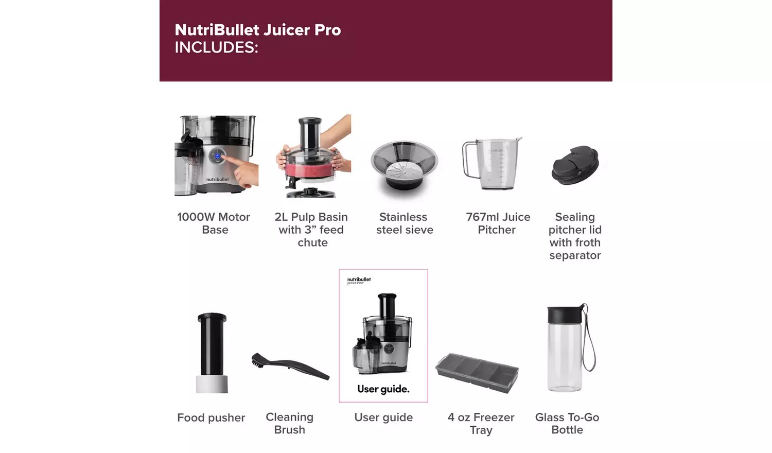 The handy pitcher closes so you can make enough for a couple of juices and or store it the fridge in the echo friendly glass bottle. The set also comes with a pair of freezer trays with snap on/off lids, each with either 2-ounce or 4-ounce compartment sizes lets you freeze juice for any purpose. You and your family can enjoy freshly made, nutritious, delicious juice every single day with NutriBullet Juicer Pro. This complete home juicing system is the ultimate package for juice lovers. With a large 2L pulp basin and a 767ml froth separating pitcher.