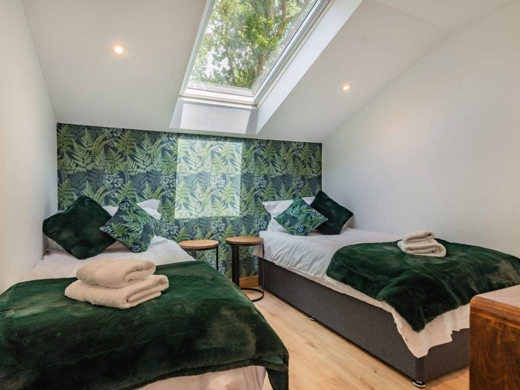 The Lucky stable has two floors, two bedrooms upstairs each with their own unique extending balcony windows, there is also another bedroom downstairs and a sofa bed with an extending privacy screen. Each room has been divinely decorated, our bedroom was adorned with a pretty green accent wall decorated with green ferns, as well as a bronze parrot and a pretty gold pineapple side lamp. There are little reminders that are you are in the countryside throughout, such as a stunning carved dog, horseshoe door handles and horse head figurines.