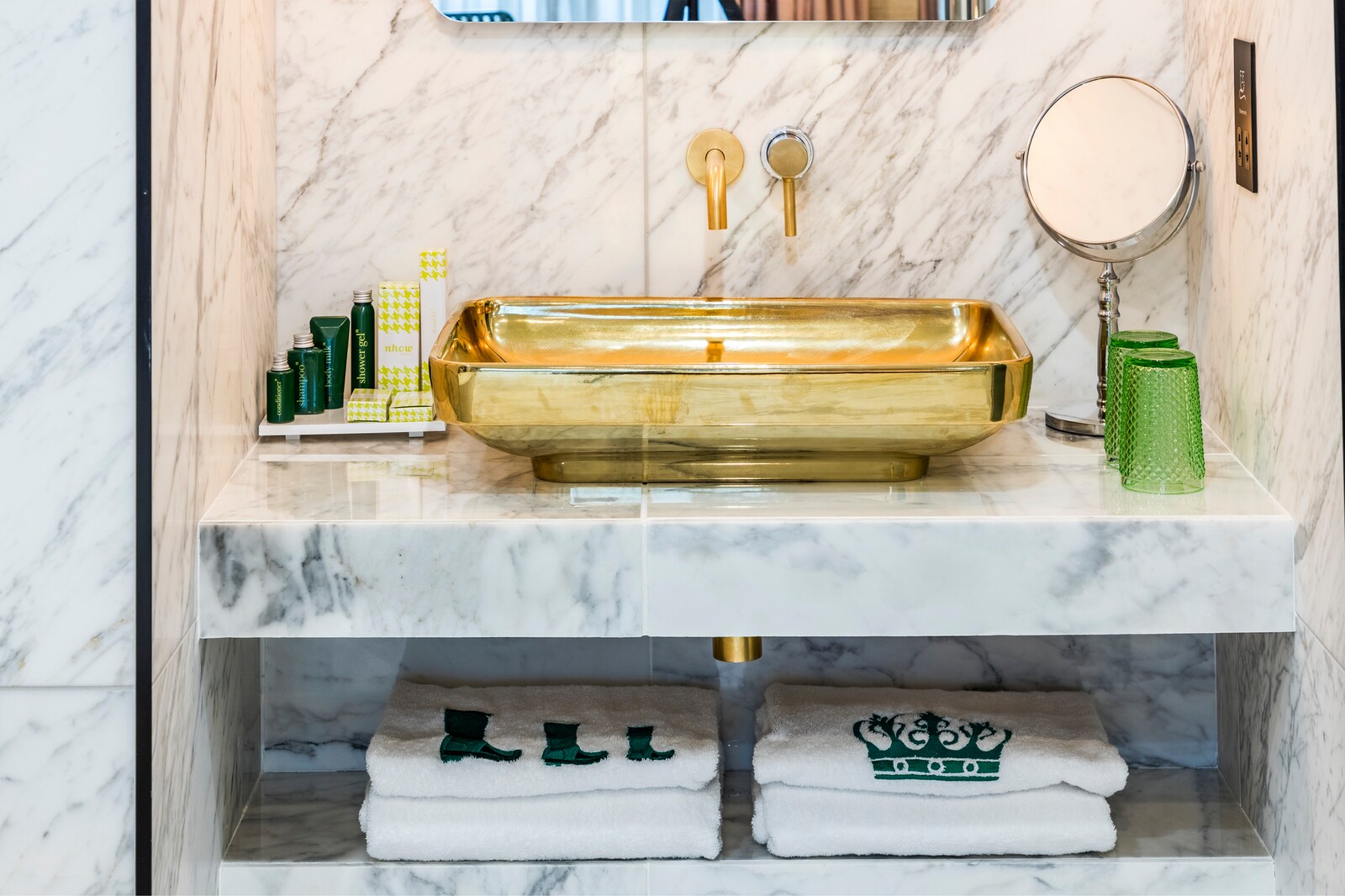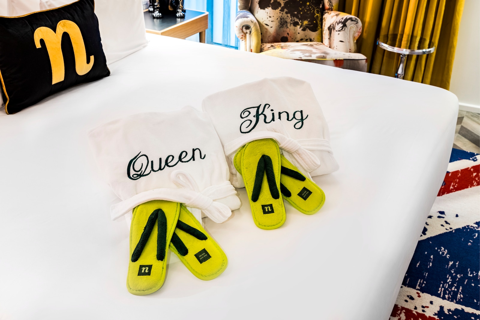 The hotel rooms lay behind traditional front doors in an array of beautiful bright colours, whilst the room doors are lit the hallway is a little darker giving you the feeling you are on a treasure hunt. It isn’t just the doors that look stunning, the rooms are as delightful as the reception. Why not give yourself a treat and stay in the spacious penthouse where every little detail has been thought out for you, from comfortable bright green slippers to robes embossed with king and queen lettering, towels adorned with crowns and boots, alongside a bath you can’t wait to jump in and stunning murals. The penthouse bar has everything you need for a night in or a nightcap and if you fancy curling up in front of the ample tv, the royal green sofa is not just stylish it’s comfortable too. Above the dining table are stunning hanging lights and the gold/royal green theme continues throughout. Plenty of toiletries await, as does a walk-in shower big enough for two and the gold shiny sink looks pretty against the marble background.