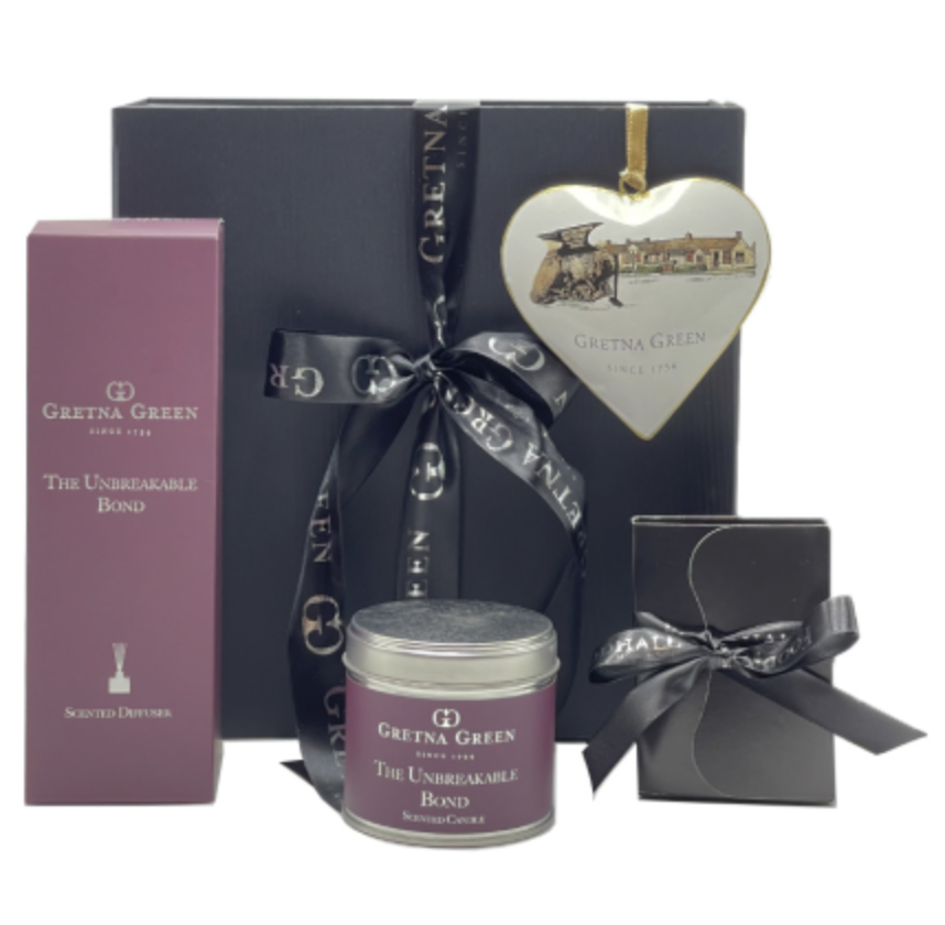 The Gretna Green Unbreakable Bond Diffuser available in a gift set including a candle, diffuser, heart-shaped hanging decoration, a beautiful gift box and chocolates for £49.99