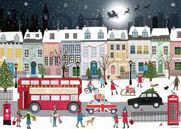 This isn’t just another Christmas puzzle, it’s a portrait of nostalgia and festivity intertwined. As the pieces click into place, a scene unfolds of a London street transformed into a winter wonderland. A classic red double-decker bus glides through softly falling snow, its headlights reflecting on wet cobblestones. Shoppers in scarves hurry past lamplit shopfronts, their hands full of brightly wrapped gifts. The faint shimmer of fairy lights hints at a story told through windows, one of warmth, community, and the quiet joy of the holidays.